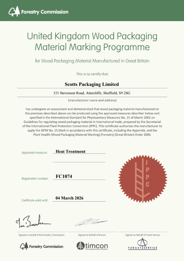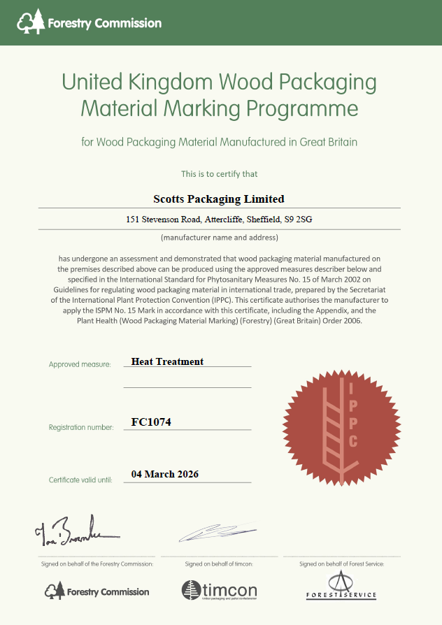 We are pleased to announce we now have running alongside Scotts Transportation our sister company Scotts Packaging Limited, the Packaging side of our company makes and delivers all types of boxes, crates and pallets in all sizes. All our packaging is made from heat treated timber which complies with the Forestry Commission requirements and that each delivery can be accompanied with certification. The production and quality of our cases is first rate. If you would like us to quote for any future orders you may require for either transportation, packaging or both, please do not hesitate to contact us.
